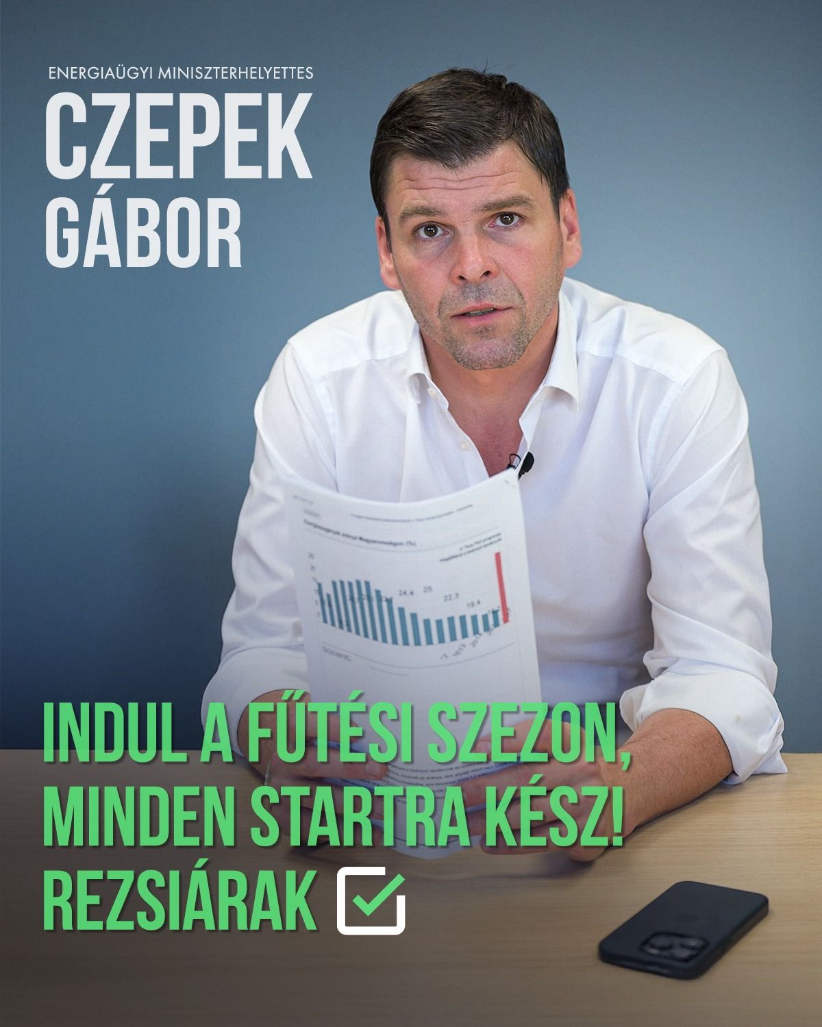 Czepek Gábor Facebookon jelentette be: A magyar családok ebben a fűtési szezonban továbbra is számíthatnak a rezsicsökkentésre, de érdemes figyelni a Tisza Pártra, ugyanis nem csak adót emelnének, de a rezsicsökkentést is megszüntetnék.