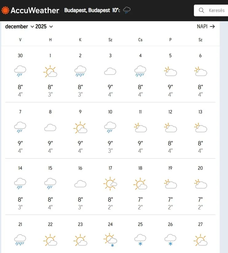 Lassan nem hogy karácsonykor, de szinte télen sincs már hó a magyar fővárosban, így rengeteg ember számára csak nosztalgikus emlék a fehér karácsony. A budapesti lakótelepi gyerekek pedig mítoszként tekintenek a könyékbeli szánkódombra, ahol már régóta nem lehet szánkózni. Ám idén karácsonykor sokak titkos vágya válhat valóra – az AccuWeather előrejelzése szerint. A népszerű meteorológiai portál ugyanis szentestére, valamint karácsony első és második napjára is havat ígér a november 9-én közzétett prognózisában. Mutatjuk is a beszédes ábrát! Vagyis idén egészen különleges lehet az ünnep!
