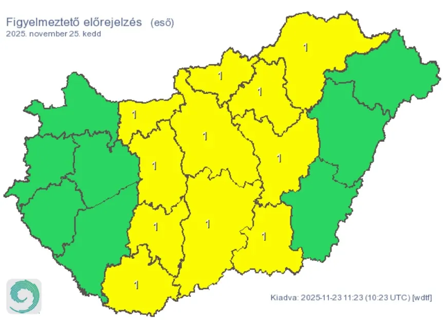 2025. november 25-ére, keddre 11 vármegyére adtak ki elsőfokú riasztást eső miatt. Ez azt jelenti, hogy az alábbi térképen sárgával jelölt területeken 24 óra alatt több mint 20 mm csapadék hullhat.