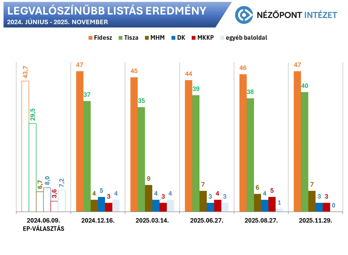 Augusztus vége óta rengeteg esemény történt a magyar politikában. A kormányoldal megkezdte „győzelmi terve” végrehajtását, s ennek keretében meghirdette az Otthon Start-programot, a 14. havi nyugdíjat, a vállalkozói terheket csökkentő csomagot, valamint fegyverpénzt fizetett és elengedte a háromgyermekes anyák jövedelemadóját is. A Donald Trumppal és Vlagyimir Putyinnal való találkozók hírei is kedvezően hatottak a kormány megítélésére, hiszen mindkét egyeztetésen a Fidesz kulcstémái határozták meg a napirendet: a rezsicsökkentés védelme és az ukrajnai béke megteremtése. Mindez a kormányoldal enyhe növekedését eredményezte, augusztusról novemberre 46-ról 47 százalékra erősödött a kormánypárt a Nézőpont Intézet által rendszeresen bemutatott „legvalószínűbb listás eredmény” bázisán. A június végén mért támogatottsághoz (44 százalék) képest ez már három százalékpontos emelkedés.
