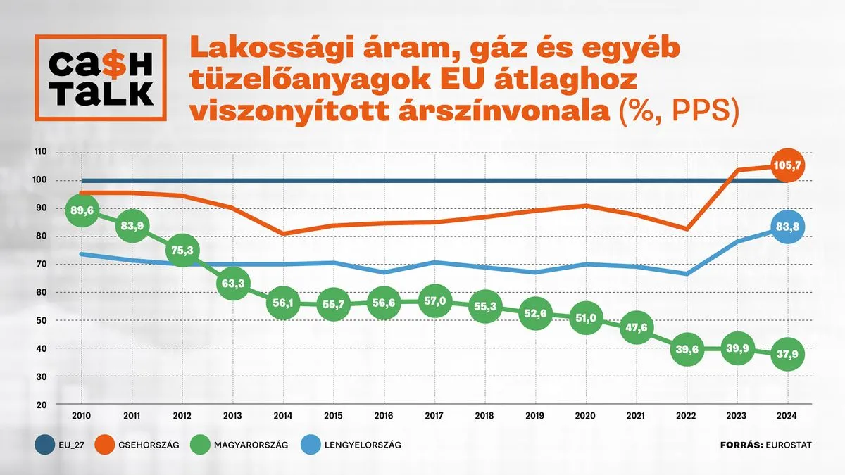Az elmúlt 14 évben a magyar családok rezsiköltsége folyamatosan az uniós átlag alatt maradt, sőt, távolodott tőle. Ezzel szemben Csehország és Lengyelország sorsa intő jelként szolgálhat mindenki számára - mondta Szalai Piroska miniszterelnöki főtanácsadó a Kontextus Cash Talk műsorában. A csehek 2010-ben még hasonló szintről indultak, mint mi – az uniós átlag 90 százalékáról –, ám mára már bőven az átlag fölött, 105 százalékon járnak. A lengyeleknél is hasonló a helyzet: a háború őket is kilőtte, és ma már ők is jóval drágábban jutnak energiához.