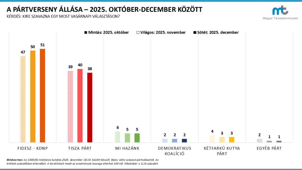 A Magyar Társadalomkutató december 18–19. között végzett telefonos közvélemény-kutatása szerint a Fidesz–KDNP (51 százalék) tovább növelte előnyét a Tisza Párttal szemben: a novemberben mért 10 százalékpontos különbség decemberre 13 százalékpontra emelkedett. A kormánypártok támogatottságának növekedése mögött több tényező együttes hatása állhat: a digitális térben mutatott fokozott jelenlét, Orbán Viktor nemzetközi politikai aktivitása, a háborúellenes országjárás, illetve azok közösségimédia-visszhangja, valamint a 2025 második felétől fokozatosan bevezetett kormányzati jóléti intézkedések. A 2025-ös év utolsó három hónapjának adatai alapján egyértelműen kijelenthető, hogy ezt az időszakot a Fidesz–KDNP politikailag megnyerte: míg októberben csak 8, decemberben már 13 százalékpont a kormánypártok előnye.
