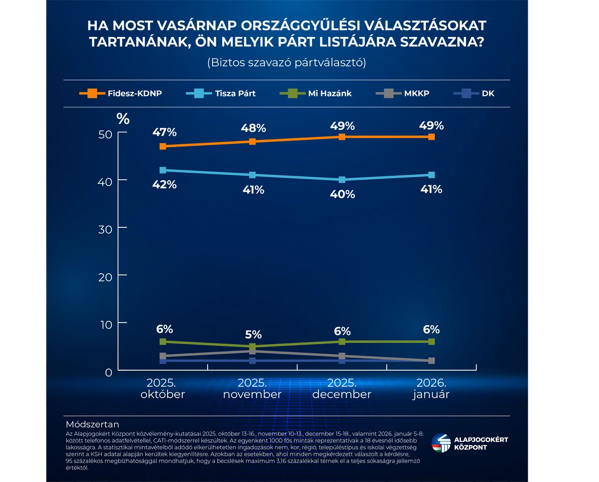 Az Alapjogokért Központ október óta havi rendszereséggel publikálja országosan reprezentatív pártpreferencia-méréseit. Az őszi politikai szezon indulása óta a népszerűségi trendek egyértelmű helyzetről árulkodnak: a Fidesz-KDNP vezető pozícióját stabilizálta, előnyét pedig a kezdeti 5 százalékpontról csaknem megduplázta. A kormánypártok jelentős – de nem behozhatatlan – fölénye 2026 év elején is megmaradt: a biztos szavazó pártválasztók 49 százaléka szavazna egy most vasárnap esedékes választáson listájukra, míg Magyar Péterék megtorpantak, a Tiszát támogatók aránya 40-42 százalék között mozgott az utóbbi hónapokban. Mindez jól mutatja, hogy az ellenzéki formáció számára az év eleje sem bizonyult sikeresnek, részben a korábbi ügyek utóhatásai, részben az „újévi” – viták miatt.