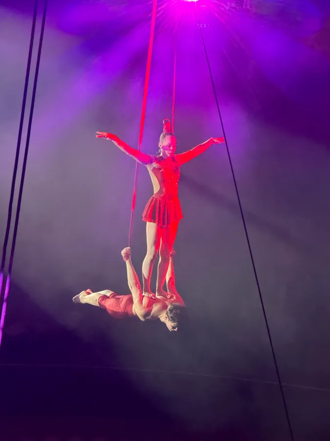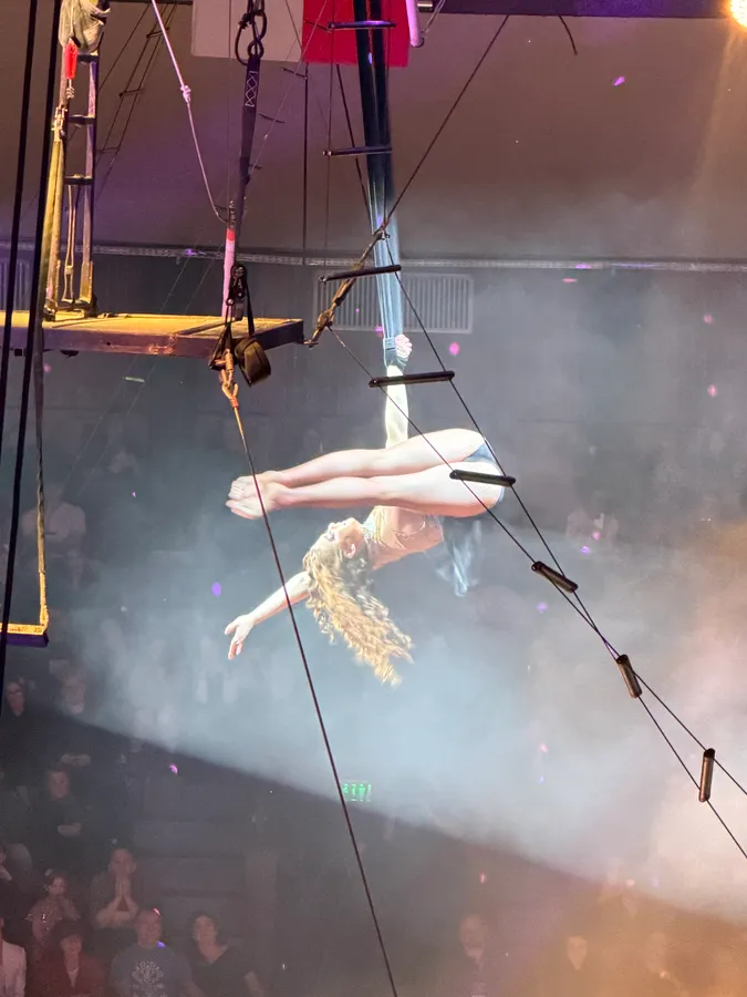 – mesélte az artistaművész enyhe akcentussal, de kiváló mondatszerkesztéssel. A légtornász az előadáson egy hulahoppal kombinált gurtniszámmal lepte meg a közönséget.
