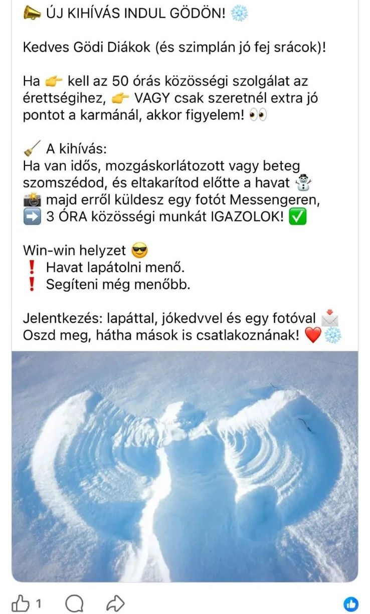 Felhívás a gödi diákoknak! Ha kell az 50 órás közösségi szolgálat az érettségihez, vagy ha van idős, beteg szomszédod és előtte eltakarítod a havat, majd erről fotót küldesz nekem üzenetben, akkor 3 óra közösségi munkát igazolok neked. Havat lapátolni menő, segíteni még menőbb!