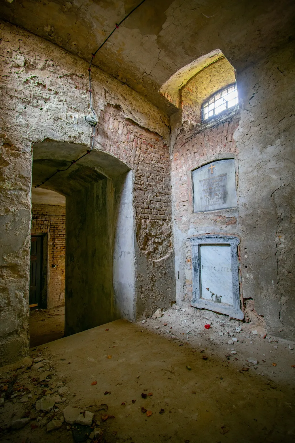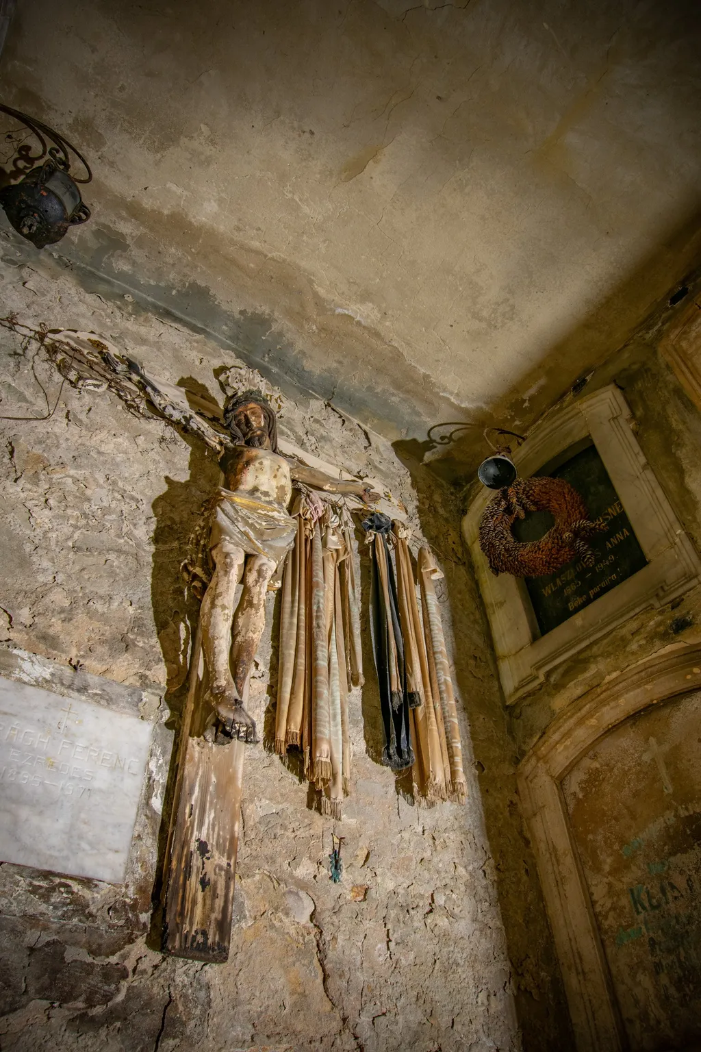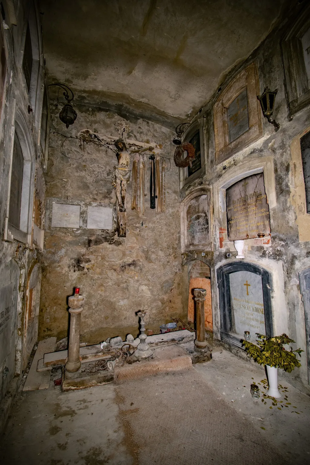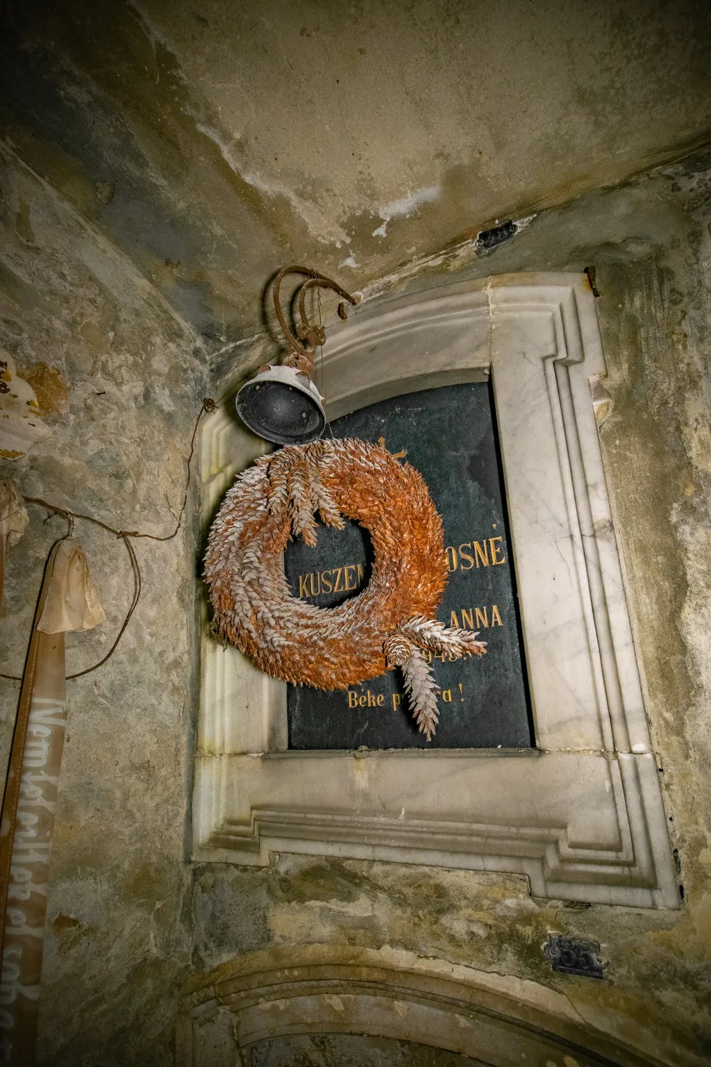 A kápolna évek óta elhagyatott lehetett, amikor az urbexes ott járt. Márványtáblák jelzik, hogy több embert is a kápolnában helyeztek végső nyugalomra. A koszorúk már elszáradtak, a gyertyák teljesen leégtek. A feledés homályába merülnek a több, mint 100 éves sírok. Megkopott a Jézust a kereszten ábrázoló szobor is, de a pompájából nem veszített.