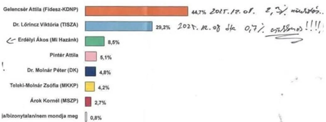 Magyar Péterék nem dicsekedtek el azzal, hogy a Tisza januári belső felmérése szerint Somogy 01-es választókörzetében a Fidesz jelöltje, Gelencsér Attila közel 45 százalékkal vezet, míg a Tisza jelöltje 29 százalékon áll. Kézzel oda is írták, hogy decemberhez képest a Fidesz erősödött, míg a Tisza gyengült - írta hétfői bejegyzésében Deák Dániel, a A XXI. Század Intézet vezető elemzője.