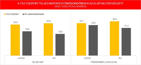 Az előző évekhez hasonlóan 2025-ben is a TV2 lett a legnézettebb csatorna teljes napon és főműsoridőben egyaránt, mindkét kiemelt korcsoportban. A kiemelkedő tévés főszezonnak köszönhetően pedig az idei már a negyedik olyan ősz volt, mikor a TV2 lett a nézők első számú választása főműsoridőben is.