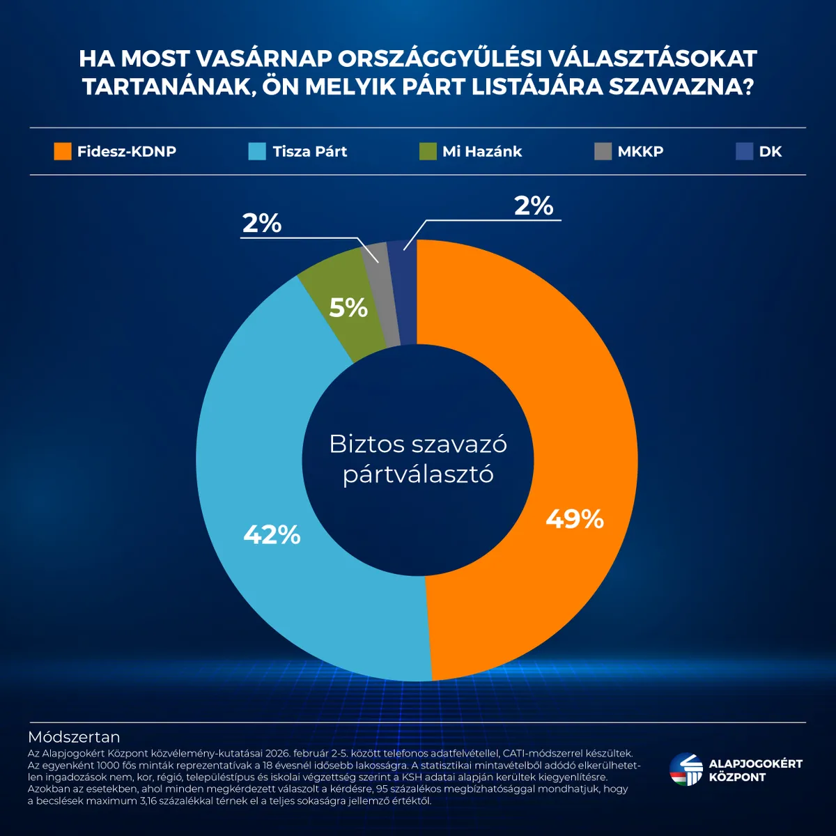 Módszertan: Az Alapjogokért Központ közvélemény-kutatásai 2025. október 13-16., november 10-13., december 15-18., valamint 2026. január 05-08. és február 02-05. között telefonos adatfelvétellel, CATI-módszerrel készültek. Az egyenként 1000 fős minták reprezentatívak a 18 évesnél idősebb lakosságra. A statisztikai mintavételből adódó elkerülhetetlen ingadozások nem, kor, régió, településtípus és iskolai végzettség szerint a KSH adatai alapján kerültek kiegyenlítésre. Azokban az esetekben, ahol minden megkérdezett válaszolt a kérdésre, 95 százalékos megbízhatósággal mondhatjuk, hogy a becslések maximum 3,16 százalékkal térnek el a teljes sokaságra jellemző értéktől.