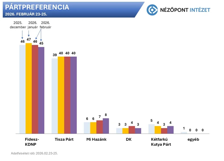 A hivatalos kampányidőszak megkezdése után készített szokásos felmérés alapján a Nézőpont Intézet szerint nincs érdemi változás a pártok versenyében. A kormánypárt előnye a Tisza Párttal szemben változatlanul magas. Sem a gödi akkumulátorgyár, sem Magyar Péter „kábítószergyanús anyaggal” kapcsolatos ügye nem mozgatta meg az erőviszonyokat. Egy „most vasárnapi” választáson a legvalószínűbb listás eredmény, amely az összes részvételét biztosra mondó válaszadó pártpreferenciáját figyelembe veszi, alapján a Fidesz-KDNP listája 45, a Tisza Párt listája 40 százalékot kapna, amely megfelel az elmúlt hetek eredményeinek.