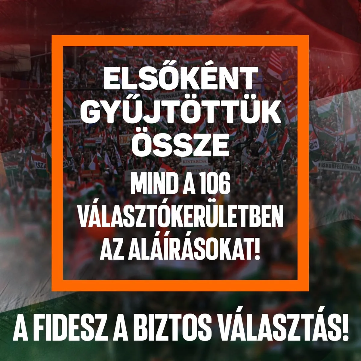 "A 106 jelöltünk délelőtt 10 órára - elsőként - minden körzetben összegyűjtötte a szükséges számú aláírást. A Fidesz az aláírásgyűjtés során fölényes győzelmet aratott a Tisza Párt felett: a Nemzeti Választási Iroda hivatalos adatai alapján a Fidesz 196 000, míg a Tisza Párt 110 000 aláírást adott le" - olvasható a bejegyzésben.