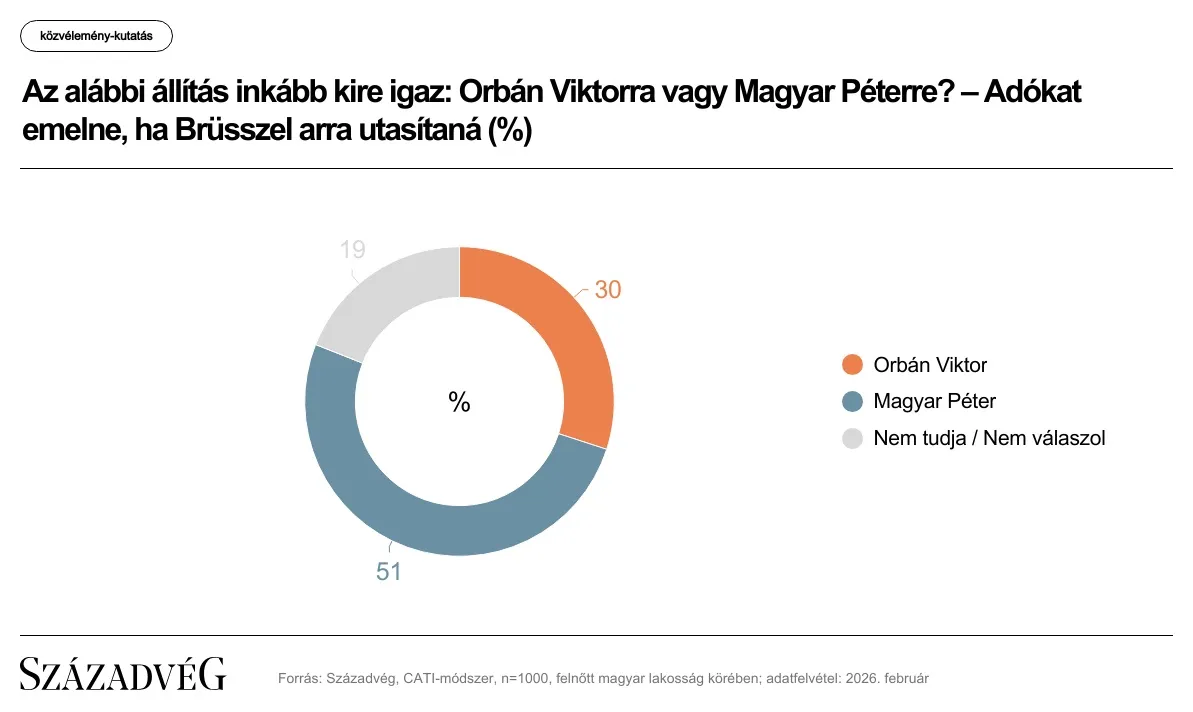 A felmérés az esetleges gazdaságpolitikai következmények megítélését is vizsgálta. Arra a kérdésre, hogy Az alábbi állítás kire igaz inkább, Orbán Viktorra vagy Magyar Péterre? – Adókat emelne, ha Brüsszel erre utasítaná a megkérdezettek 51 százaléka válaszolta Magyar Pétert, míg Orbán Viktorról ugyanezt 30 százalék feltételezte.