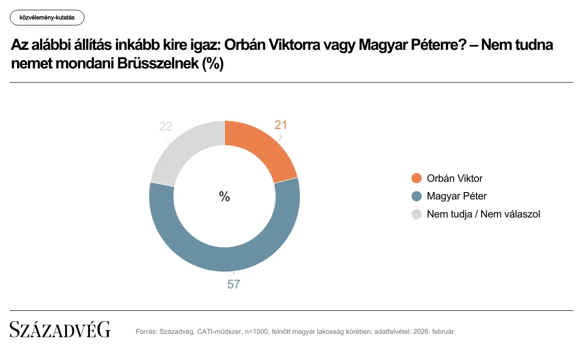 A Századvég februári kutatása szerint arra a kérdésre, hogy Az alábbi állítás inkább kire igaz, Orbán Viktorra vagy Magyar Péterre? – Nem tudna nemet mondani Brüsszelnek, a válaszadók 57 százaléka Magyar Pétert nevezte meg, míg Orbán Viktorról csak 21 százalék gondolja ezt.