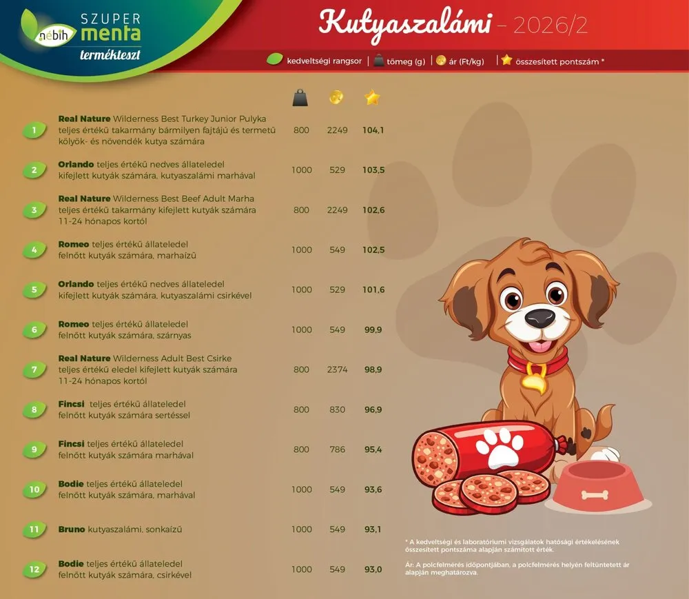 A Nemzeti Élelmiszerlánc-biztonsági Hivatal (Nébih) Szupermenta programja 12 hazai és külföldi kutyaszalámit vetett alá szigorú vizsgálatnak, hogy kiderüljön, mennyire biztonságosak és táplálóak ezek az eledelek. Mutatjuk, mely termékek végeztek az élen!