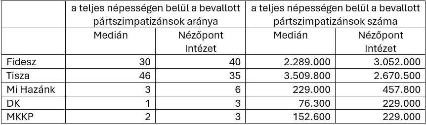 2026-ban előreláthatóan 7,63 millió honfitársunk szavazhat belföldön vagy külföldön pártlistákra és egyéni jelöltekre. Elméletileg az ő véleményüket méri fel egy tökéles közvélemény-kutatás, ezért a továbbiakban ezekkel az adatokkal számolunk. Ezek alapján elmondható, hogy a Nézőpont több mint hárommillió, a Medián kevesebb mint 2,3 millió Fidesz-szimpatizánst azonosít. A Tisza esetében a Nézőpont 2,67 millió, míg a Medián 3,5 millió szimpatizánst azonosít be.