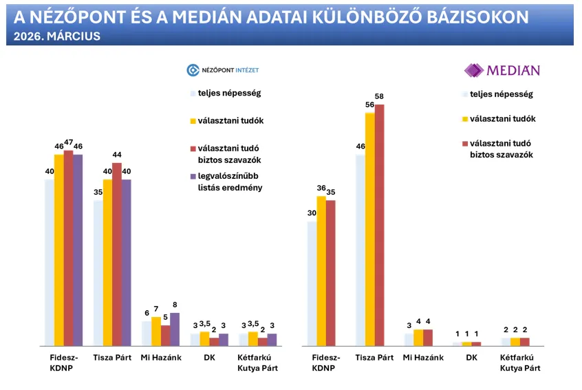 Ezek alapján a választani tudók bázisán hat, a választani tudó biztos szavazók bázisán három százalékpontos Fidesz-előny mutatható ki. Azaz, ahol a Nézőpont hat százalékpontos Fidesz-előnyt mutatott ki, ott látott a Medián húsz százalékpontos Tisza-előnyt.