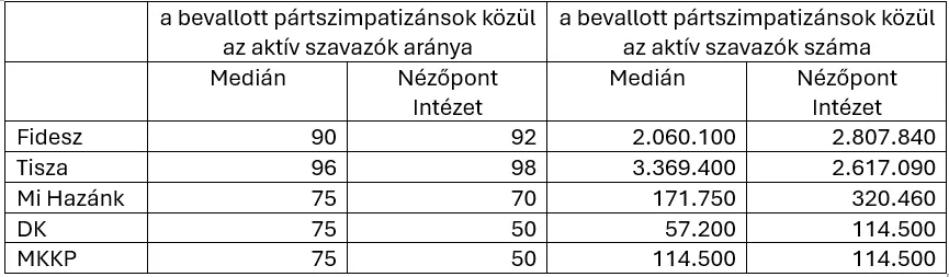 Ezek alapján a Nézőpont Intézet szerint a Fidesznek 190 ezerrel több aktív pártszimpatizánsa van, mint a Tiszának, míg a Medián szerint a Tiszának 1,3 millióval több aktív pártszimpatizánsa van, mint a Fidesznek. Ez azért is lenne meglepő, mert a Fidesznek a 2024-es, 60 százalékos részvétellel zajló EP-választáson csaknem kétmillió aktív szavazója volt, így az ő számuk a magas részvétel és a legalább nyár óta zajló kampány ellenére a Medián szerint nem változott.