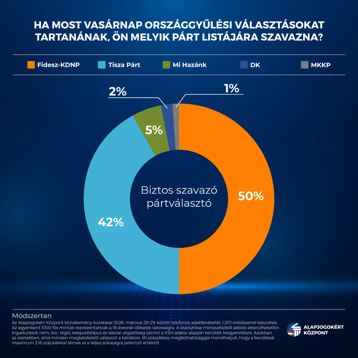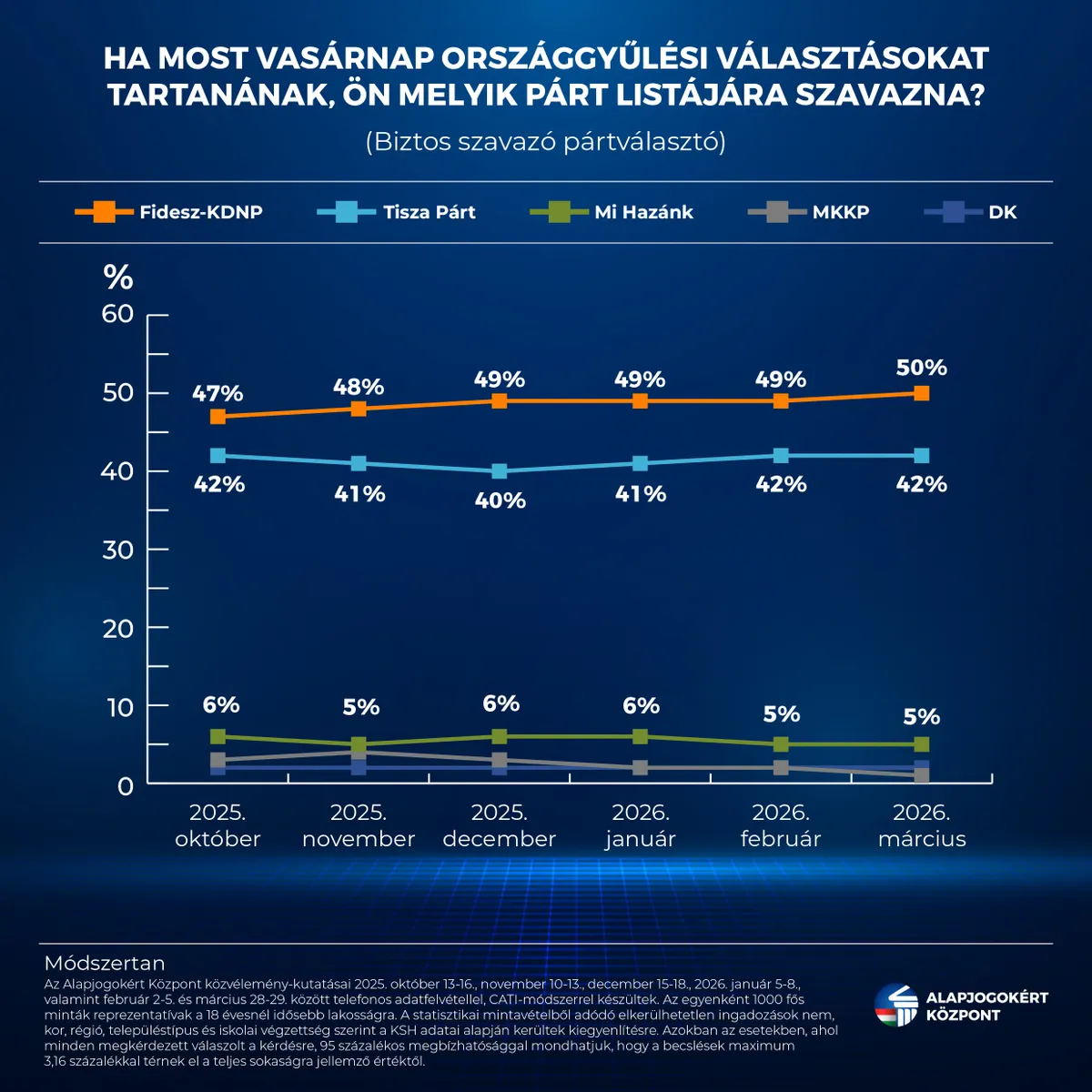 Az Alapjogokért Központ legújabb, március végén készült közvélemény-kutatása szerint a Fidesz–KDNP támogatottsága elérte az 50 százalékot a biztos szavazó pártválasztók körében, amivel megközelíti a 2022-es választások körüli csúcsteljesítményét. Az idősoros adatok alapján elmondható, hogy a kormánypárt támogatottsága a 2025 októberi 47 százalékról hónapról hónapra, folyamatosan emelkedve jutott el márciusra az 50 százalékos szintig, miközben a Tisza Párt 42 százalékon stabilizálódott, és nem tudott áttörést elérni.