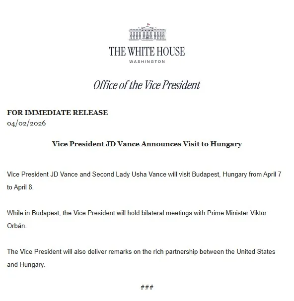 Magyar idő szerint csütörtök este, nem sokkal 21 óra előtt hivatalos közleményt adott ki a Fehér Ház, hogy Budapestre érkezik az amerikai alelnök, JD Vance és várandós felesége, Usha. A közlemény szerint budapesti tartózkodása alatt az alelnök kétoldalú megbeszéléseket folytat Orbán Viktor miniszterelnökkel. Az alelnök emellett beszédet is tart majd, amelynek témája az Egyesült Államok és Magyarország közötti szoros partnerség lesz.