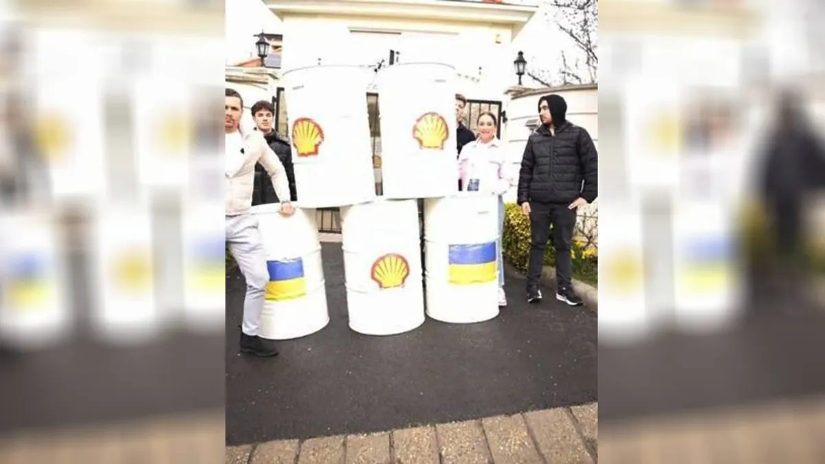 A csoport néhány üres olajos hordóval érkezett Kapitány házához. A hordók egyik oldalán a tiszás szakértő korábbi munkahelyének logója, a másikon pedig az ukrán zászló volt látható.