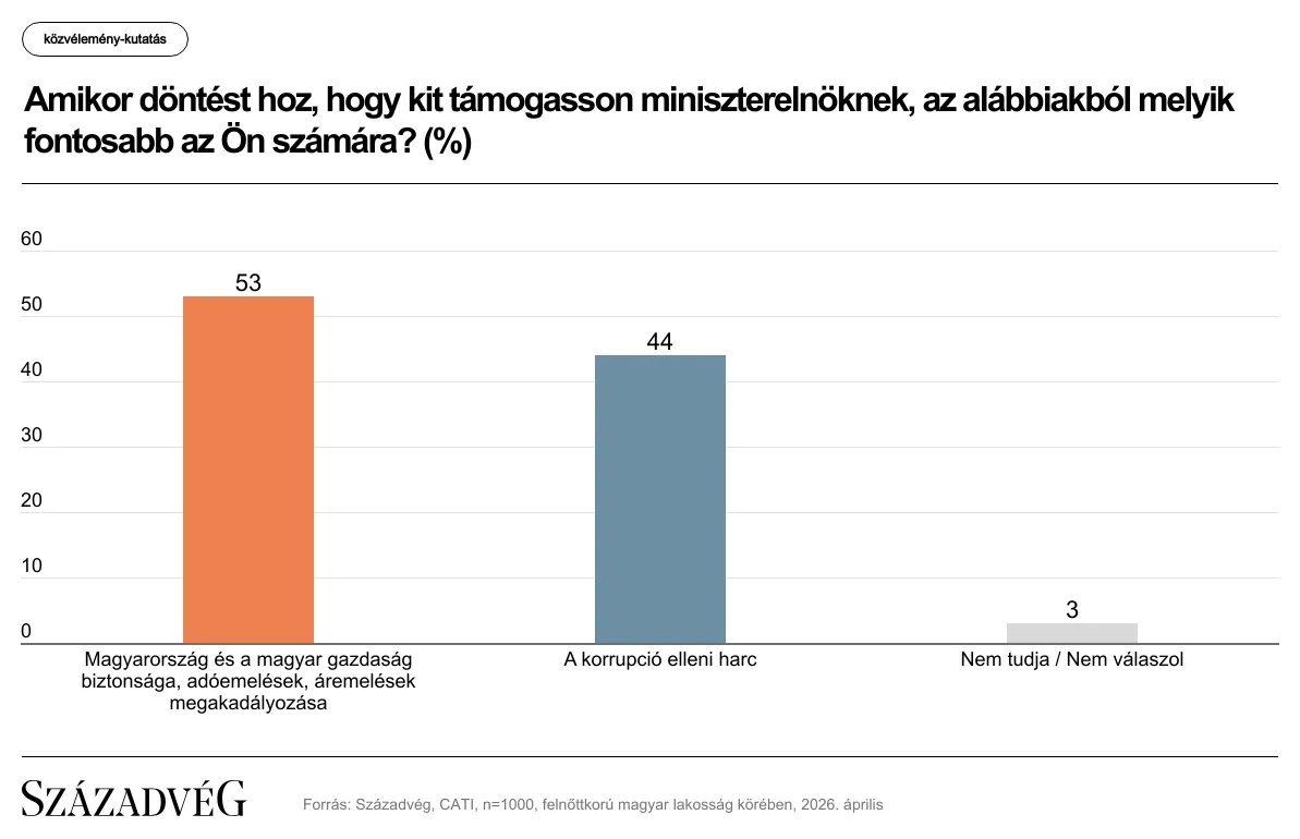 Egyesek szerint a magyarok most vasárnap sorsot is választanak maguknak, ezért sem mindegy, hogy melyik témát tartják a kampányhajrában meghatározónak és milyennek látják a két legnagyobb induló párt listavezetőjét. A fokozódó nemzetközi konfliktusok és az egekbe szökő energiaárak láttán nem meglepő, hogy a magyarok 56 százaléka a választáson Magyarország békéjét és a magyar gazdaság stabilitásának megőrzését, az adó- és energiaár-emelések elkerülését tartotta legfontosabb döntési szempontnak. Elvégre megfelelő mennyiségű és árú energia nélkül nemcsak a lakossági rezsiszámla emelkedne a mostani duplájára vagy háromszorosára, de azok a gyárak is elvándorolnának tőlünk, amelyek pont Magyarország stabil energetikai helyzete miatt költöztek az országba. A korrupció elleni harcot 42 százalék nevezte meg fő döntési szempontként, míg 2 százalék nem válaszolt.