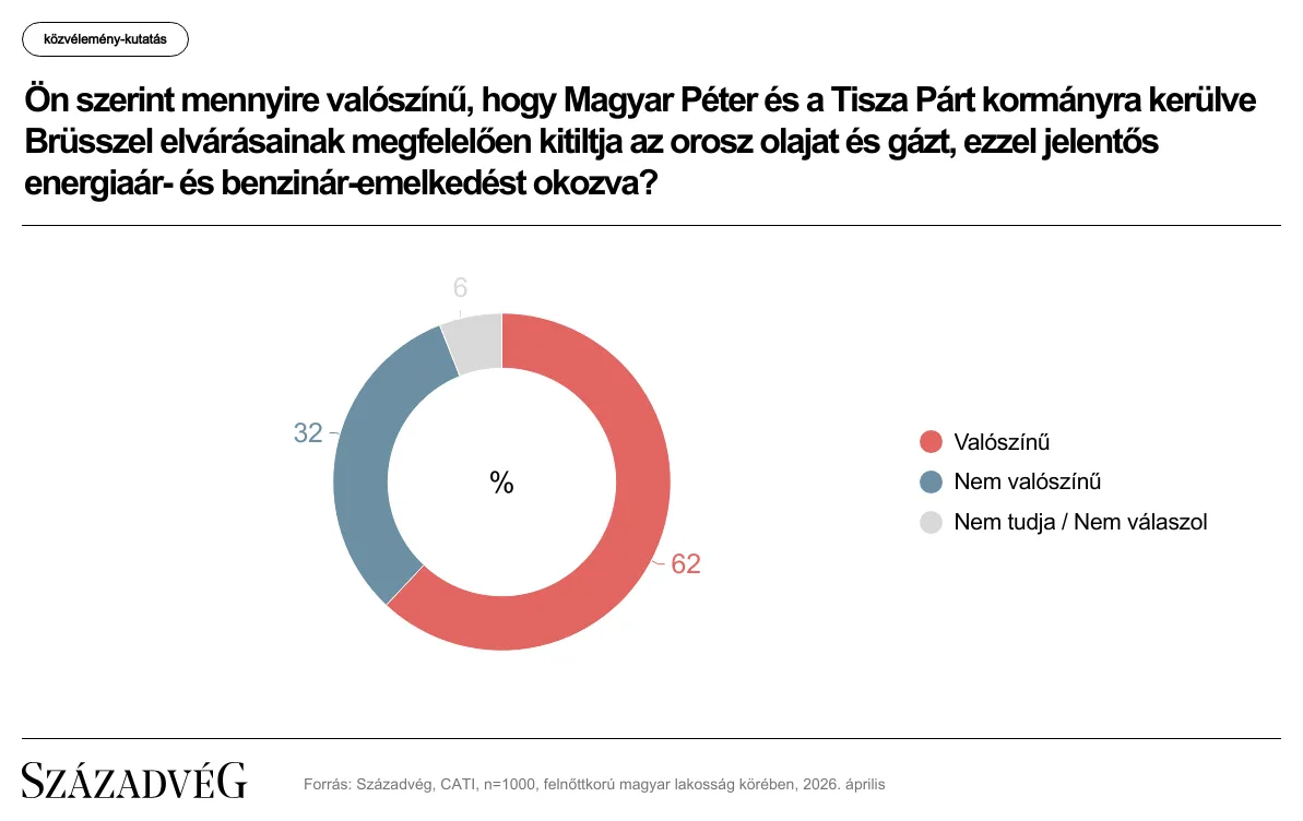 Kutatásunkban azt is megkérdeztük, hogy a válaszadók mennyire tartják valószínűnek, hogy egy esetleges Tisza kormány Brüsszel elvárásainak megfelelően teljesen kitiltja Magyarországról az orosz olajat és gázt, ami jelentős energiaár- és benzinár-emelkedést okozna. A megkérdezettek 62 százaléka ezt elképzelhetőnek tartotta, 32 százalék szerint nem valószínű, míg 6 százalék nem tudott vagy nem akart válaszolni.