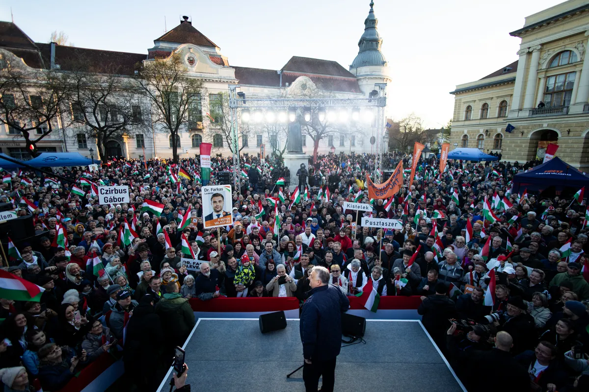 A március 15-ei, minden korábbinál több embert megmozgató Békemenet után kezdődött, és immár harmadik hete tart Orbán Viktor országjárása. A miniszterelnök ezúttal Szentesre látogatott, ahol a Kossuth téren fogadta az előző alkalmakhoz hasonlóan nagy tömeg. Az egybegyűlteket Takáts Tamás dallal köszöntötte a politikai felszólalók előtt. Őt Szabó István, a térség fideszes országgyűlési képviselőjelöltje, majd Lázár János követte, utánuk pedig a kormányfő lépett színpadra.