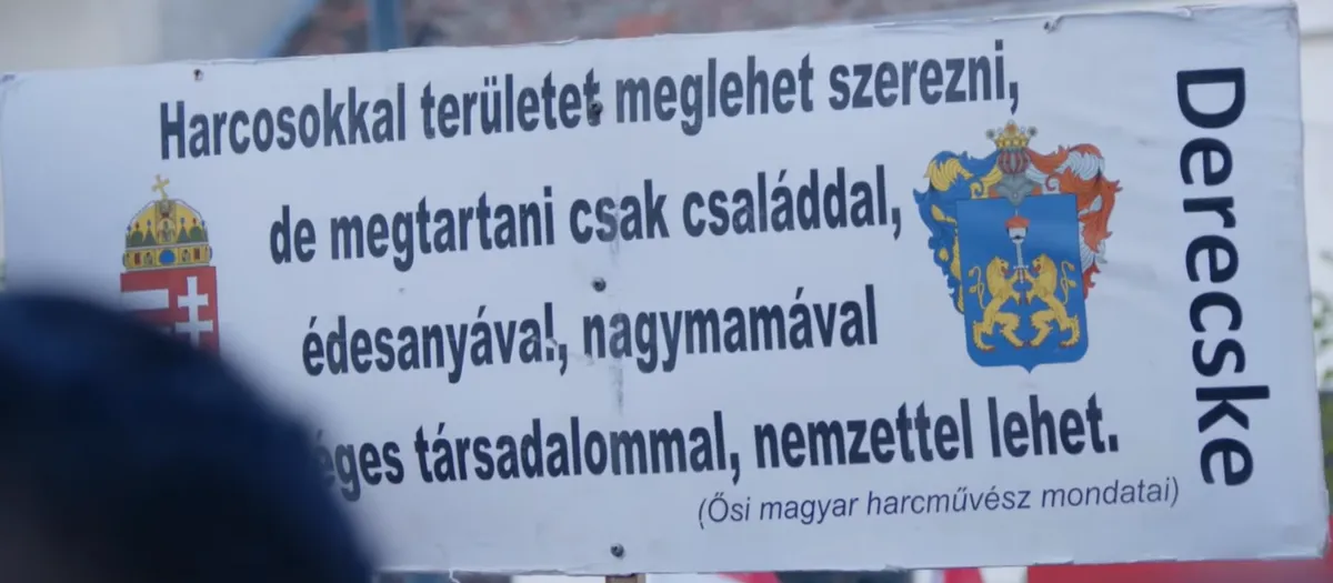 A hatalmas tömegben több tábla is feltűnt. Többen a környékbéli községek településneveit írták rá a magasba tartott táblákra, de volt, aki egy ősi magyar harcművész mondatait jelenítette meg, és azt tartotta a magasba, jól láthatóan a színpad felé mutatva.