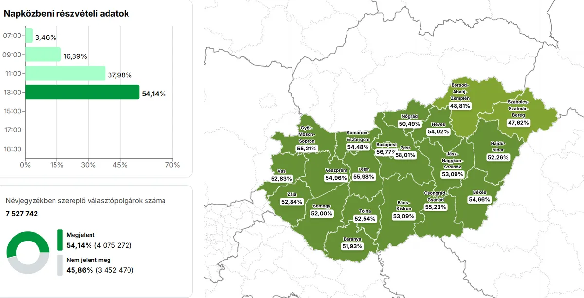 Ez azt jelenti, hogy már több mint négymillió, pontosan 4.075.272 fő voksolt. A legtöbben Pest vármegyében tették ezt 58%-os megjelenéssel, míg a legkevesebben eddig Szabolcs-Szatmár-Bereg megyében tették tiszteletüket a 13 órás adatok szerint.