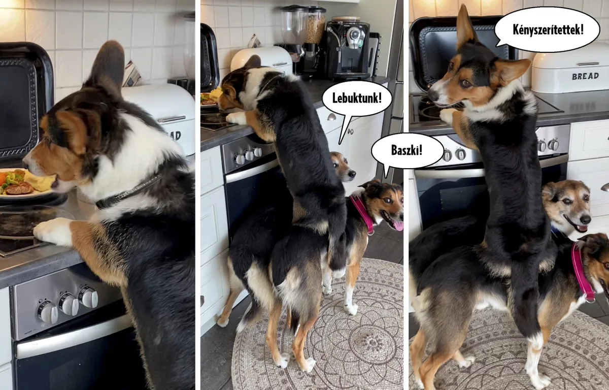 Két Border Collie, Harley és Henry úgy helyezkedtek, hogy egy szőrös lábtartót alkossanak a rövid lábú Hugónak, aki felmászva a hátukra így már elérte a tűzhelyen lévő finom falatokat.