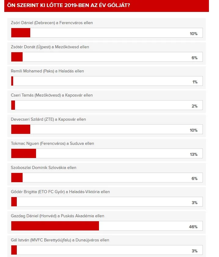 Gazdag elsöprő fölényét jelzi, hogy a második ferencvárosi Tokmac Nguen (a Suduva elleni góljával) 13, a Puskás-díjas Zsóri pedig 10 százalékig jutott, szoros küzdelemben megelőzve a zalaegerszegi Devecseri Szilárd bombáját (szintén 10 százalék). A kispesti játékos góljára többen szavaztak, mint ahányan az utána következő ötre – Nguen 13, Zsóri 10, Devecseri 10, Szoboszlai Dominik 6, Zsótér Donát 6 – összesen.