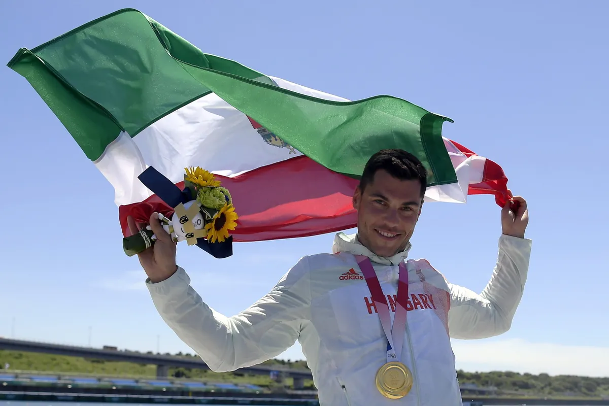 Az aranyérmes Tótka Sándor a férfi kajak egyesek 200 méteres versenyének eredményhirdetésen a világméretû koronavírus-járvány miatt 2021-re halasztott 2020-as tokiói nyári olimpián a Sea Forest Kajak-kenu Pályán 2021. augusztus 5-én.