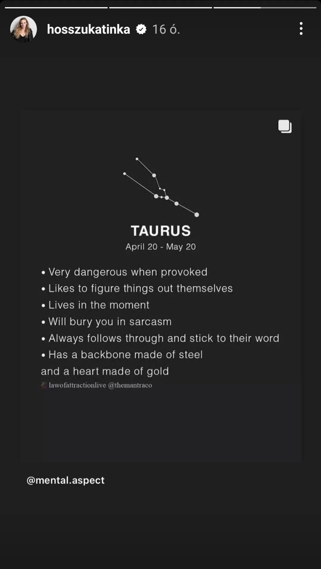 Hosszú Katinka spirituálisabb oldalát mutatta meg nemrég a közösségi médiában. Instagram-történetébe ugyanis egy asztrológiai bejegyzést osztott meg, amely csillagjegyét, a bikát mutatja be.