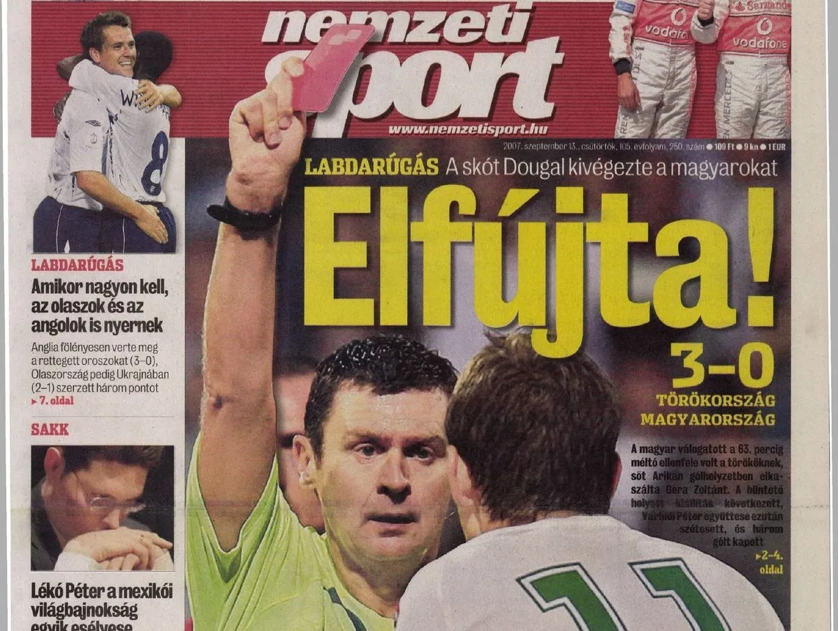 Akkor az Európa-bajnokság selejtezőjében csaptak össze a gárdák, s a törökök hazai pályán 3-0-ra nyertek. A meccs kulcspillanata az volt, amikor a hazaiak kapusa a tizenhatoson belül egyértelműen buktatta a ziccerben lévő Gera Zoltánt. Normál esetben a kapusnak piros lap, a magyaroknak tizenegyes járt volna. Nem így történt, a skót Stuart Dougall sárga lapot adott a magyarok legjobbjának, Gerának ez volt a második sárgája, így 0-0-s állásnál kiállították.