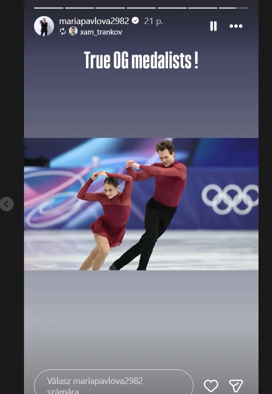 Pavlova igen aktív a közösségi médiában, és az éjjel az Instagram-sztorijában megosztott egy üzenetet, amit a 2014-es, Szocsiban rendezett téli olimpia bajnoka, Makszim Trankov küldött neki. Ez egy fotó Pavlováékról, azzal a felirattal, hogy „a valódi olimpiai érmesek” - írja a Magyar Nemzet.