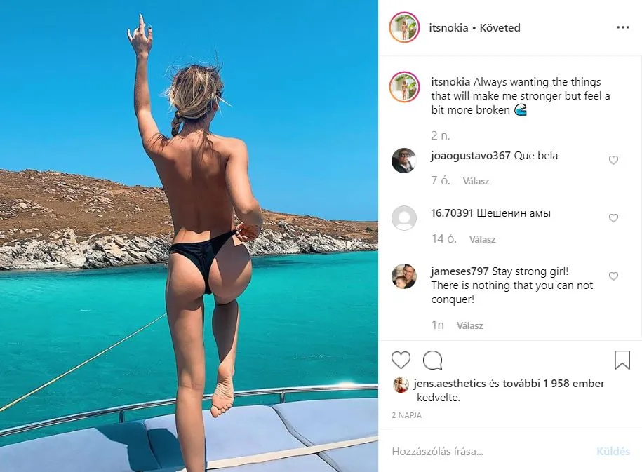 Bikini felső nélkül hajózott ki a Nokia művésznéven futó fiatal aktmodell. A szőke lány az Instagramon gyűjti a követőket szép számmal, de van egy privát oldala is, ahol exkluzív képeket láthatnak egy előfizetésér cserébe a leglelkesebb rajongói.