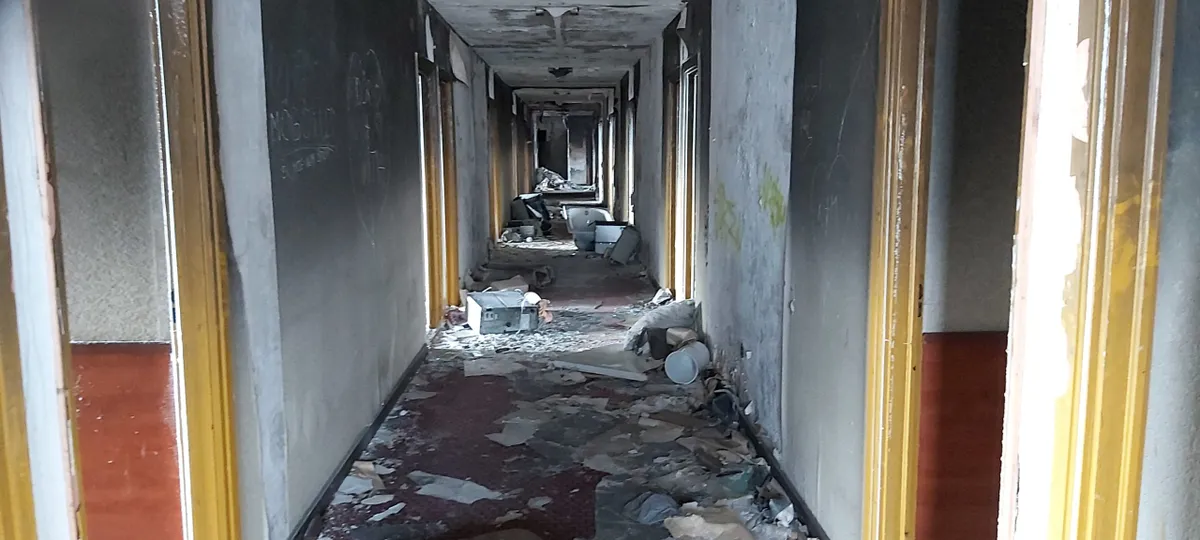 Nem kell építészmérnöknek lenni, hogy ha a helyszínen járunk, magunk is rájöjjünk, hogy az épület valóban menthetetlen. A tető teljes egészében megsemmisült, a felső két emelet kiégett. Az összes ablak betörve, az ajtók, nyílászárók mind felfeszítve és feltörve adnak utat a szél és az eső pusztító erejének. A még megmaradt bútorok és egyéb berendezési tárgyak az üszkös gerendákkal együtt az ablakokon kihajigálva, nagy kupacokban hevernek a földön, az épület mellett. A hotelben bent is mindent szétvertek, összetörtek és kifosztottak, csak a málladozó falak emlékeztetnek az egykori luxuszállodára, amiből mára már csak egy lecsupaszított csontvázépület maradt.