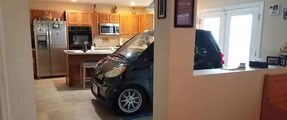 A férfi a háza nappalijába állt be az aprócska Smarttal, talán nem is volt olyan nehéz dolga azzal, hogy belavírozzon az autóval. Erre azért is volt szükség, mert a garázsban már a feleség autója foglalta a helyet.