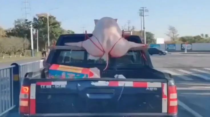 A rendőrség állított meg és filmezett le egy autót, aminek a rakterére, illetve tetejére egy döglött sertést kötöttek fel, úgy, mintha tangát viselne – vette észre a Daily Mail.