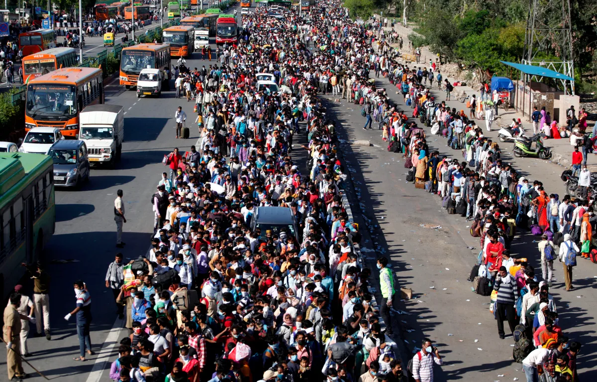 Vidéki vendégmunkások buszokra várakoznak Újdelhiben 2020. március 28-án. India hatóságai buszokat küldtek a fõvárosba, hogy hazaszállítsák a vidékrõl származó, munka nélkül maradt embereket. Narendra Modi indiai miniszterelnök négy nappal ezelõtt rendelt el háromhetes országos házikarantént az 1,3 milliárd lakosú Indiában a koronavírus-világjárvány elleni harc jegyében. Az országban 887 fertõzöttje és 20 halálos áldozata van a koronavírusnak.