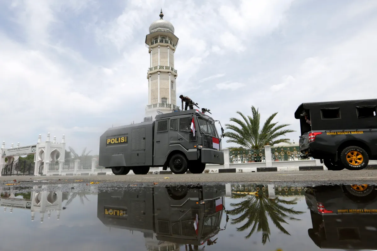 Rendõrségi vízágyúval permeteznek fertõtlenítõszert egy utcán az indonéziai Banda Acehben 2020. március 27-én. A koronavírus-járvány terjedésének megfékezése érdekében az indonéz hatóságok felszólították a lakosságot, hogy kerüljék el a nyilvános összejöveteleket, ideértve a vallási tevékenységeket is. Indonéziában 893-ra emelkedett a fertõzöttek száma, a járványban eddig 78-an veszítették életüket.