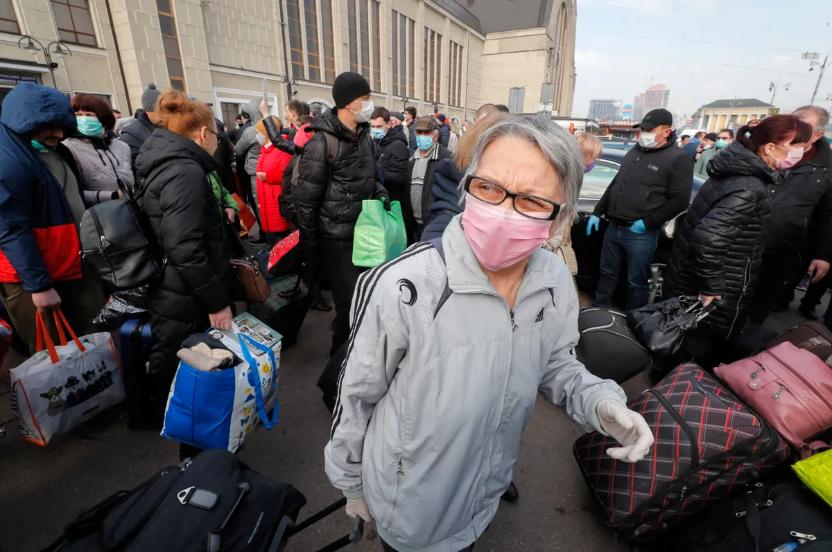 Moszkvából érkezõ ukrán utasok érkeznek egy kijevi vasútállomásra 2020. március 29-én. Az ukrán kormány döntése értelmében, a koronavírus-járvány miatt Ukrajna teljesen leállította a nemzetközi utasszállítást, azaz lezárta határait saját állampolgárai elõtt is. Az orosz állami vasúti társaság különvonatot indított az orosz állampolgárok Ukrajnából és az ukránok Oroszországból történõ hazaszállítására.