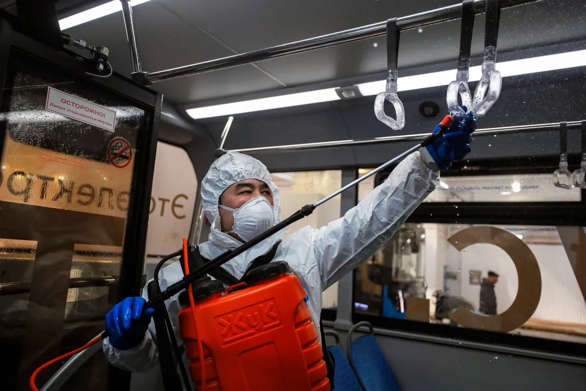 Fertõtlenítést végeznek egy busz utasterében az új koronavírus-járvány terjedésének megakadályozása érdekében Moszkvában 2020. március 20-án. Oroszországban eddig 206 megbetegedést regisztráltak.
