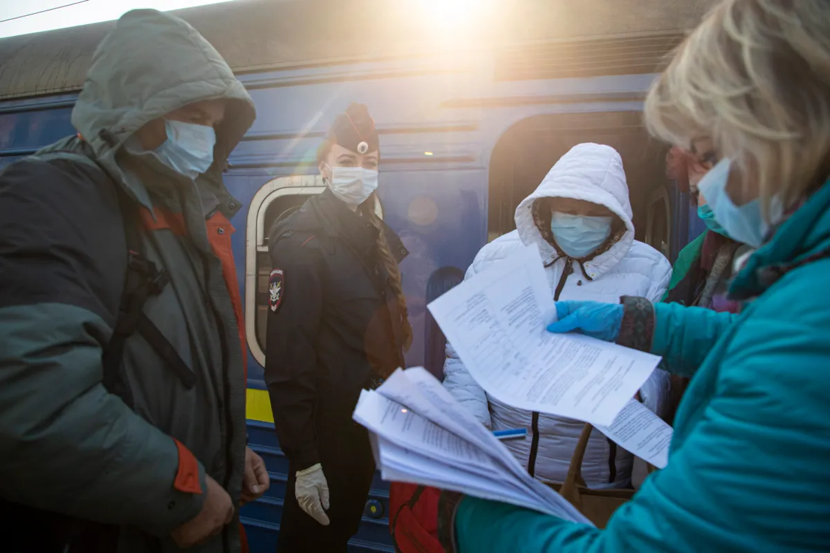 Védõruházatot viselõ munkások ellenõrzik a Kijevbõl érkezõ utasok iratait a moszkvai Kijevszkij vasútállomáson 2020. március 28-án. Az orosz állami vasúti társaság különvonatot indított az orosz állampolgárok Ukrajnából és az ukránok Oroszországból történõ hazaszállítására, miután az ukrán kormány bejelentette, hogy a koronavírus-járvány miatt Ukrajna teljesen leállítja a nemzetközi utasszállítást, azaz lezárja határait saját állampolgárai elõtt is.