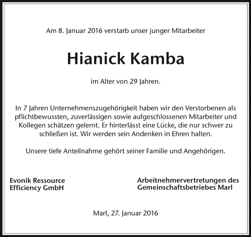 Hiannick Kamba az FC Schalke 04 nevű első osztályú német focicsapat utánpótlásában szerepelt jobb hátvédként a 2003/04-es szezonban. Edzői sokat vártak tőle, és mindenki egyetértett abban, hogy fényes karrier állhat a kongói származású futballista előtt. A szüleit azonban 2005-ben kiutasították az országból, és úgy tűnt, hogy Kambanak is követnie kell őket. Végül tartózkodási engedélyt kapott, de a karrierje kettétört. A focista pár évvel később haza is utazott, és egy energiaszolgáltatónál kapott munkát.