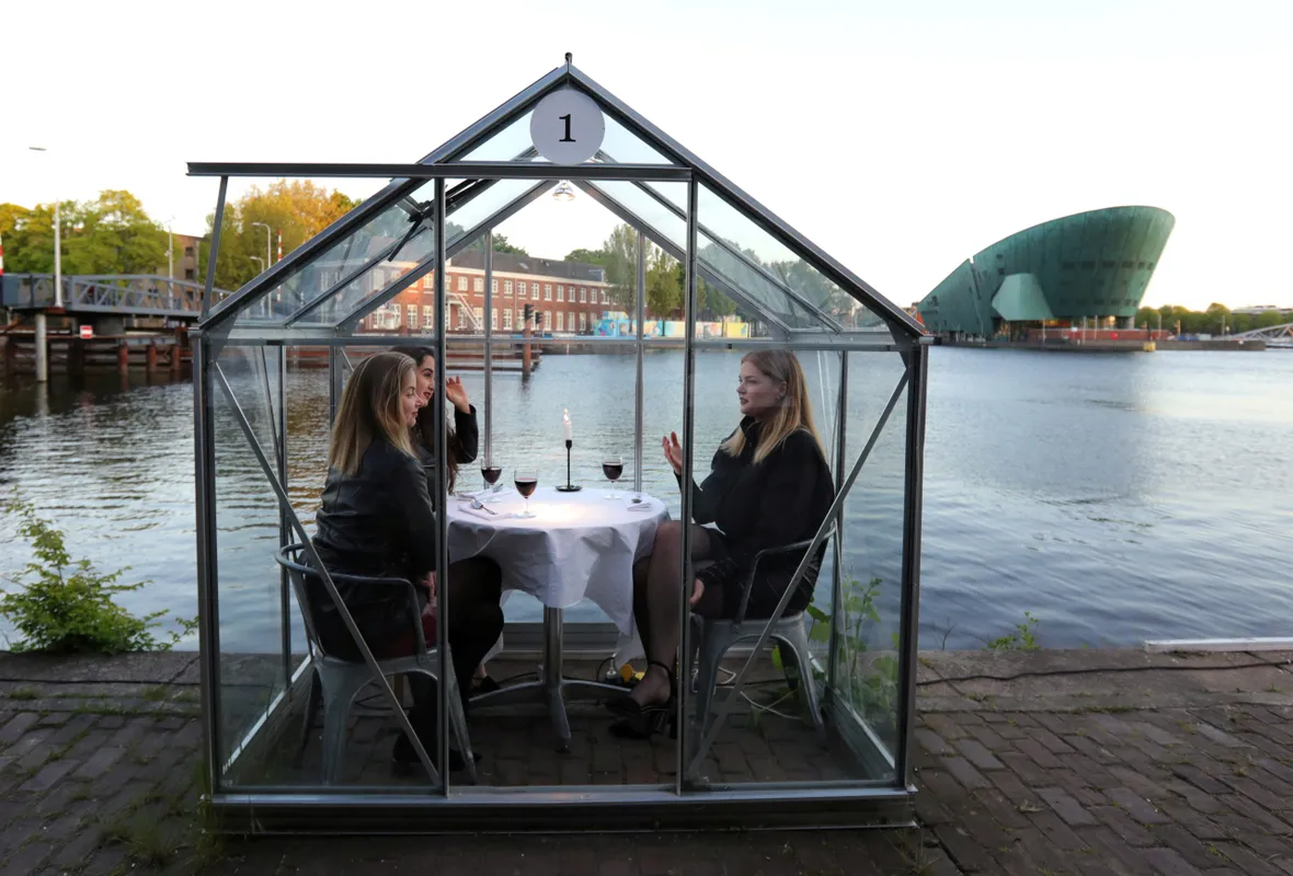 A holland főváros belvárosának fő csatornája, a Dijksgracht partján fekvő – vegán ételeket felszolgáló – étterem forradalmi ötlettel állt elő. A Mediamatic ETEN szeretné, ha az emberek evés közben is biztonságban éreznék magukat, ezért a kerthelyiségükben több, egymástól teljesen elszeparált üvegházakat állítottak fel. Az ötletgazdák úgy vélik, hogy ez lehet az egyik legbiztosabb módja annak, hogy a vendégek között ne terjedhessen a koronavírus. Az építményekbe egyszerre két- vagy háromfős társaságok ülhetnek be, és négyfogásos menüt szolgálnak fel nekik.