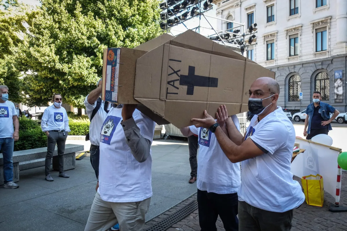 Sajátos előadással üzentek az Assotaxi nevű taxis szervezet tagjai a milánói önkormányzat épületénél szerdán.