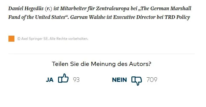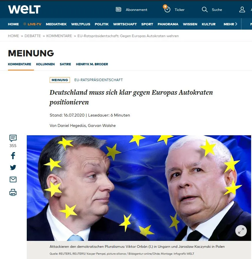 A Welt című német lap online kiadásában jelent meg egy véleménycikk, amelyben azt fejtegetik a szerzők, hogy az európai autokratákkal szembe kell helyezkednie a német kormánynak. Az olvasók óriási többsége nem ért egyet a magyar és lengyel kormányt nyíltan támadó írással.