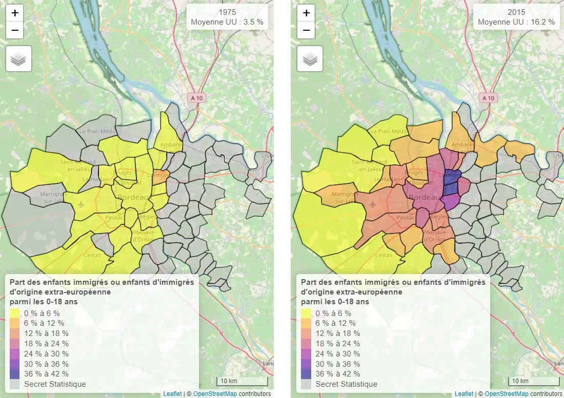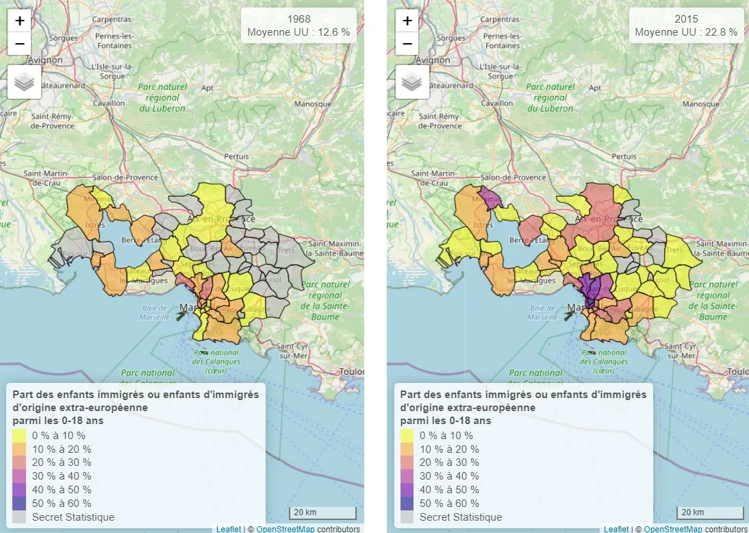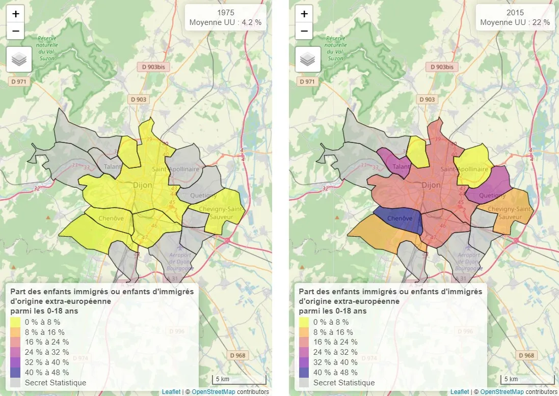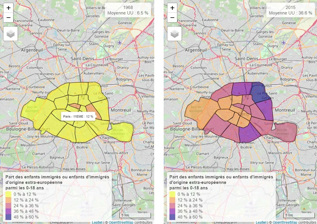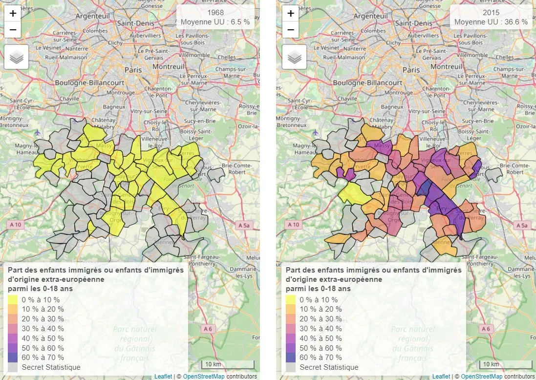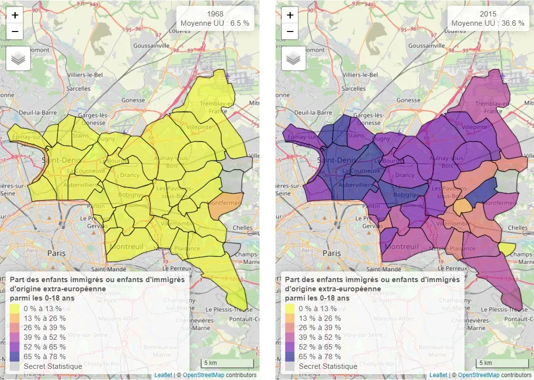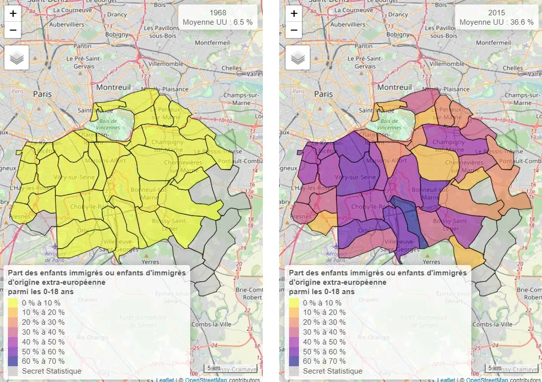 A konzervatív francia sajtót egészét lázban tartó térképeken az Európán kívüli szülőkkel rendelkező migránsgyerkekek aránya látható az összes gyerekhez viszonyítva, 1968-tól kezdve egészen a napjainkig. A különböző részarányokat különböző színkódokkal, kerületekre bontva tüntették fel.