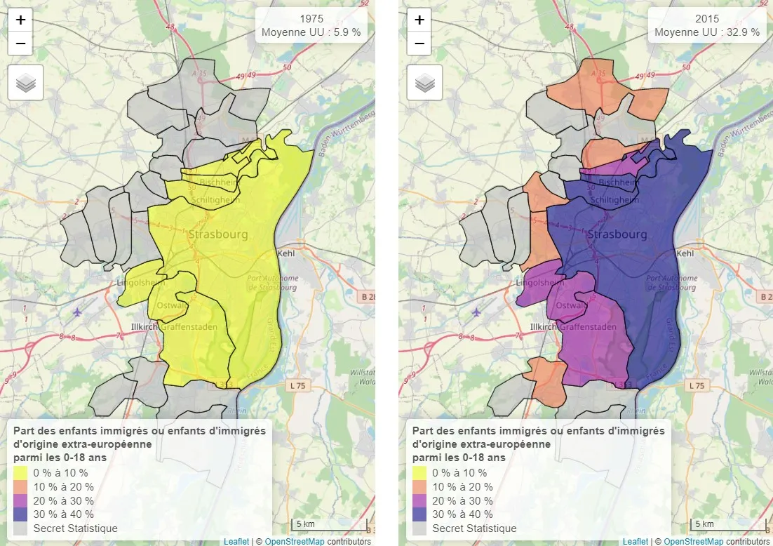 A 0-18 év közötti migrációs hátterű gyerekek aránya Strasbourgban 1975-ben és 2015-ben
